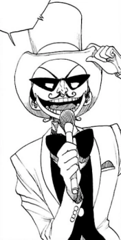 Bacon Egg is a tall, gangly, skinny middle-aged man. He has slick black hair that curls at the back of his neck, and a curled mustache. In the arena, he wears a white tuxedo with pink accents, a matching top hat, and pointed black sunglasses.