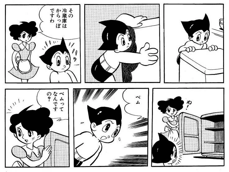 Bem's first appearance is in the 1964 manga chapter "The Last Day on Earth". One day, a strange robot called Bem arrives in Tokyo, carrying a large safe that resembles a refrigerator. Bem has fled their home planet in disguise in order to escape their creators, and Astro finds and befriends them. Eventually, Bem reveals they're not an ordinary android, but a walking bomb powerful enough to destroy the planet.