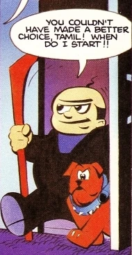 I.Q. Plenty and Spud were introduced as comedy relief during the comic's very dark early arc. They were two of the favourite characters of the creative staff, and they had major roles in later issues until a new writer could take over the series.