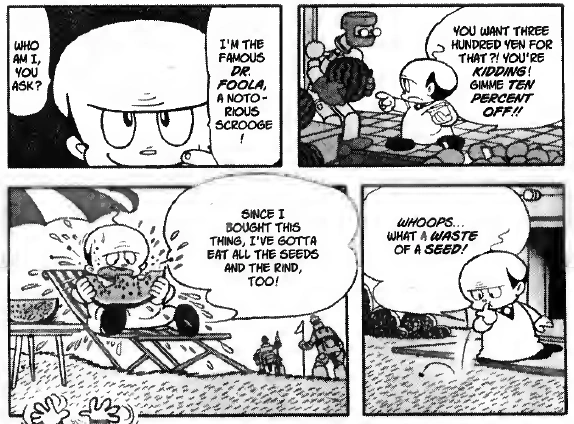 Dr. Fooler appears regularly throughout the Astro Boy manga. He is an especially prominent character in the Shogaku Ninensei manga series, a slapstick gag manga serialized from 1980 to 1981. In these stories, he is a stingy and envious scientist with a one-sided rivalry with Professor Ochanomizu. At one point, he builds a robot duck with the sole purpose of making loud noises and following Ochanomizu around.