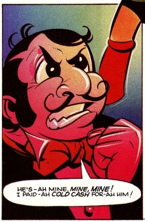 Hamegg, appearing under the name Mr. Cacciatore, is a secondary antagonist in the 1987 NOW! Comics series. He is a shady businessman and ringmaster who purchases Astro from Dr. Boynton. Cacciatore maintains aggressive control over Astro with a robot spider bomb called Bruno, and for the most part, neglects the upkeep of his other robots. When Cacciatore's circus burns down, he turns to organized crime, and acts as the middleman in orchestrating a robot siege on the Institute of Science.