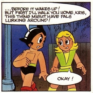 Niki also appears, reimagined and slightly redesigned, in the 1987 American comic series. In this series, she is a human girl named Krystal Kleer, and is in Astro's class at the human school. Astro calls her "Kris", and at one point saves her from a dinosaur. Kristal is the first human child that Astro befriends, and she drops Astro hints that she has a crush on him. Her first interaction with Astro is when he gets harassed in class, and she writes him a note telling him to ignore his bully, and also that she finds him cute. When he has to travel to space, she gives him a flower as a souvenir.