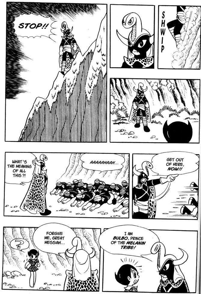 In course of time Astro and Uran are attacked by the Africans. Astro fights a giant gorilla robot they bring out against him and both he and it are apparently blown up. Uran is devastated and in her furious grief flips some of the soldiers over onto their heads by added strength the cross has given her. Their leader, Prince Bulbo of the Melanin Tribe, suddenly appears and declares to Uran that her super powers reveal her as the foretold coming messiah. To her astonishment Bulbo says it was prophesied that the messiah would have a cross on the inside of the body. Bulbo says he is a robot and he has been waiting for her to appear and help him create a paradise for poor, enslaved robots. He takes her to his palace and shows her a magnificent bedroom with human slaves.